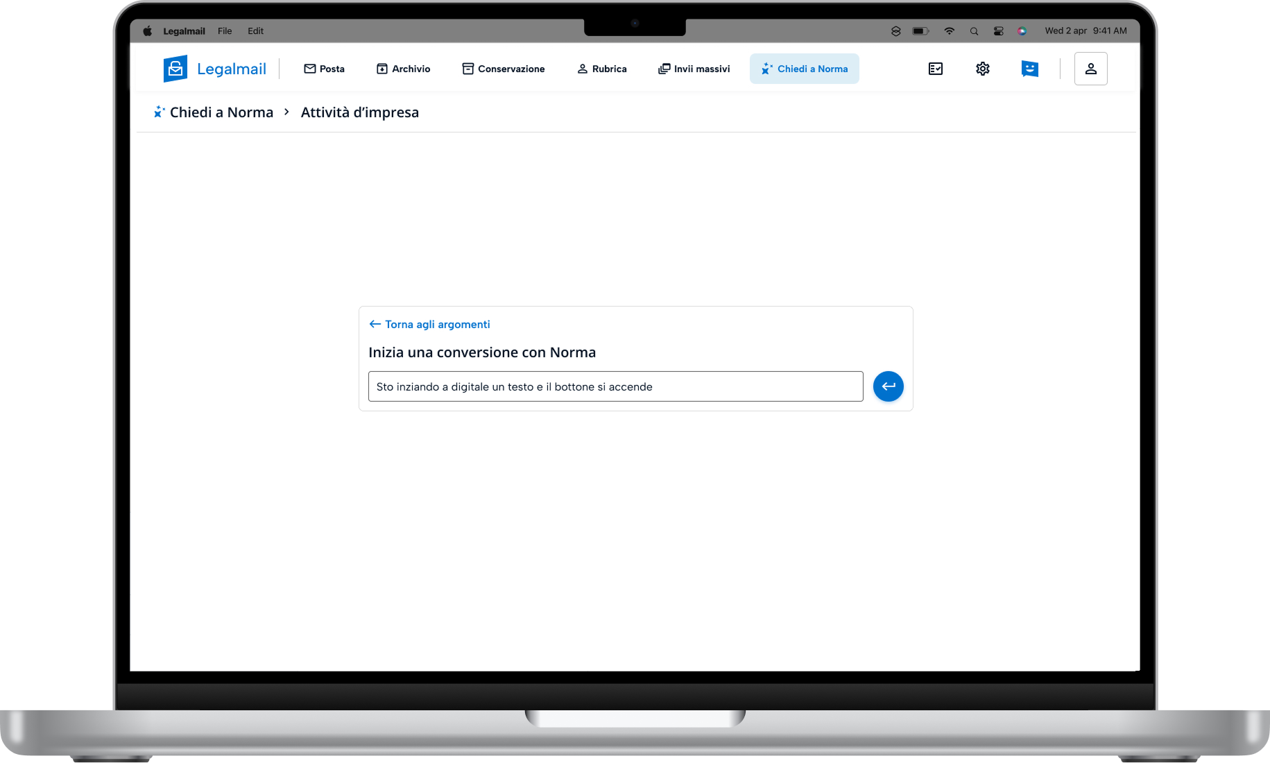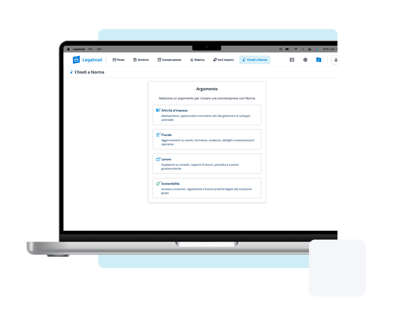 Accedi con le credenziali della tua Legalmail, clicca nella sezione “Norma”, collocata in alto, seleziona un argomento tra cui: attività d’impresa, fiscale, lavoro e sostenibilità, scrivi la domanda con un linguaggio naturale. Il sistema ti restituirà informazioni attendibili e immediatamente riutilizzabili.